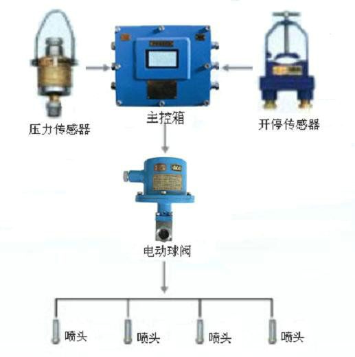 只有水壓傳感器檢測到采煤機(jī)水采水路中有一定的水壓(或工作燈開啟)時,才能允許啟動采煤機(jī)。采煤機(jī)開動后,開停傳感器(或光控傳感器)將信號送入主控箱,主控箱控制電動球閥開啟,實現(xiàn)對產(chǎn)塵點(diǎn)進(jìn)行噴霧降塵。采煤機(jī)停機(jī)(或采煤機(jī)工作燈關(guān)閉)后,主控箱控制電動球閥延時一定的時間后關(guān)閉,停止噴霧降塵。