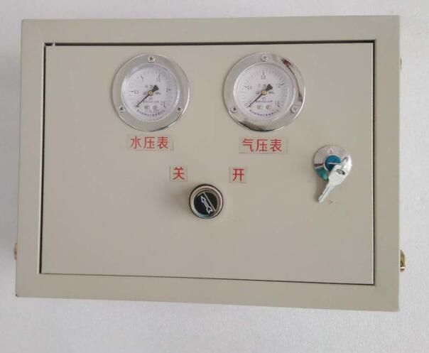 ZPFS氣控式風(fēng)水聯(lián)動(dòng)噴霧降塵裝置控制箱(以下簡(jiǎn)稱(chēng)控制箱)采用內(nèi)置風(fēng)、水控制閥對(duì)裝置用風(fēng)、水壓力進(jìn)行調(diào)控,對(duì)風(fēng)水比例進(jìn)行均衡,采用氣控閥(控制箱圖片上的“開(kāi)關(guān)”)控制噴霧裝置的開(kāi)啟與關(guān)閉??刂葡溟T(mén)扇上鑲嵌氣控閥(開(kāi)關(guān)旋鈕)控制噴霧裝置的開(kāi)啟與關(guān)閉,鑲嵌有水壓表、氣壓表,分別顯示調(diào)控后的水、氣壓力。